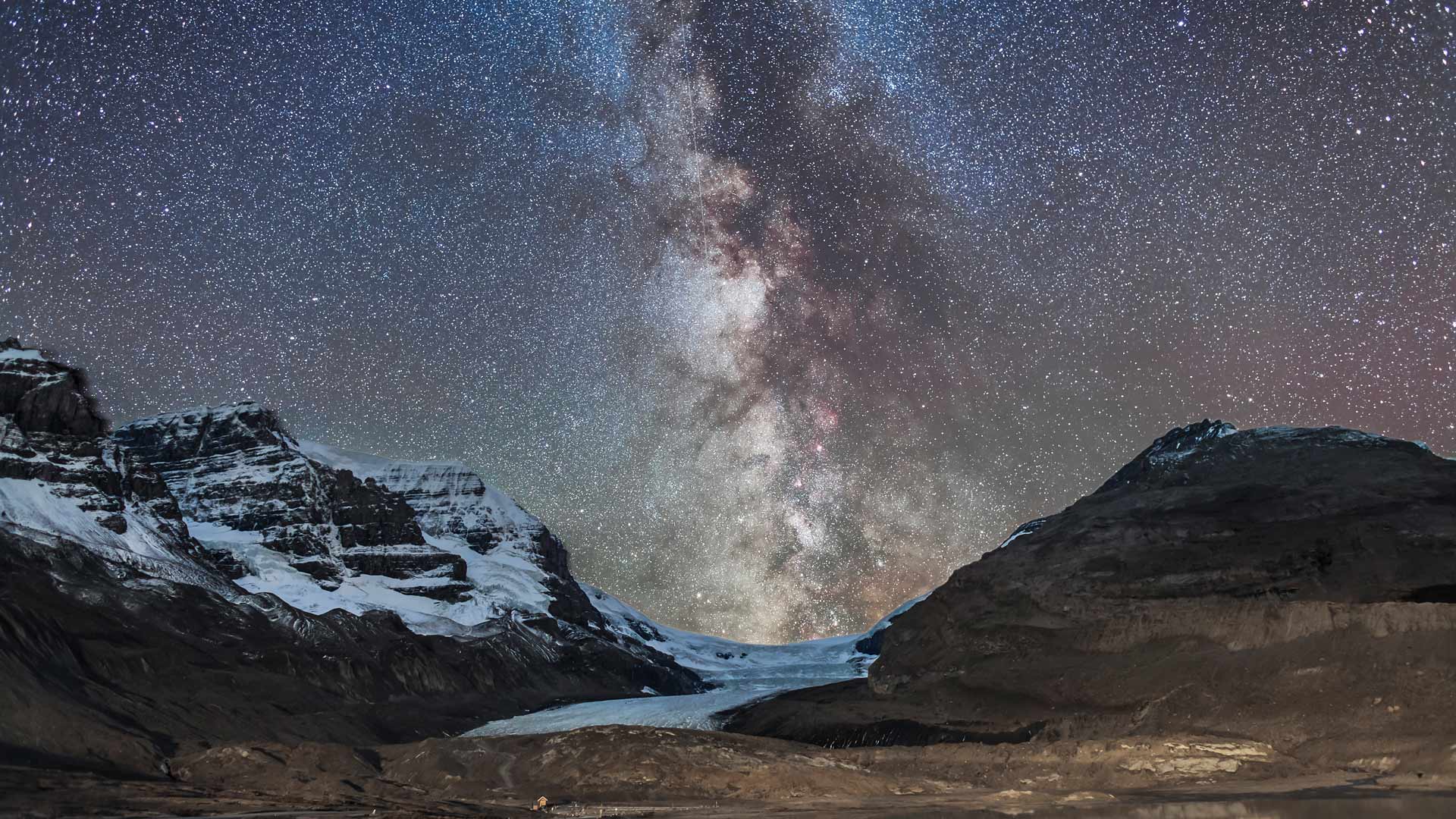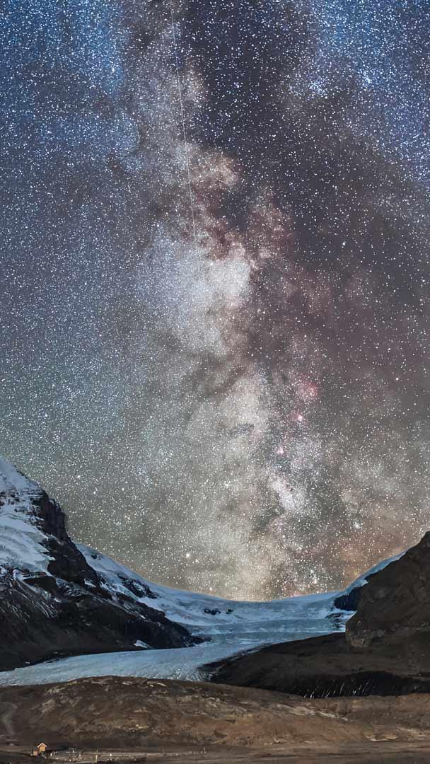 Witness the awe-inspiring sight of the Milky Way over Athabasca Glacier, amidst the rugged terrain of the Canadian Rockies at Jasper National Park, Canada. The park boasts towering peaks, serene lakes and a diverse range of wildlife. It was established in 1907 and got its name from Jasper Haws, a fur trader. A UNESCO World Heritage Site and the largest dark-sky preserve in the world, Jasper National Park lures stargazers and nature enthusiasts alike. Over the last 100 years, due to global warming, the Athabasca Glacier has been gradually melting and has lost over half of its volume.