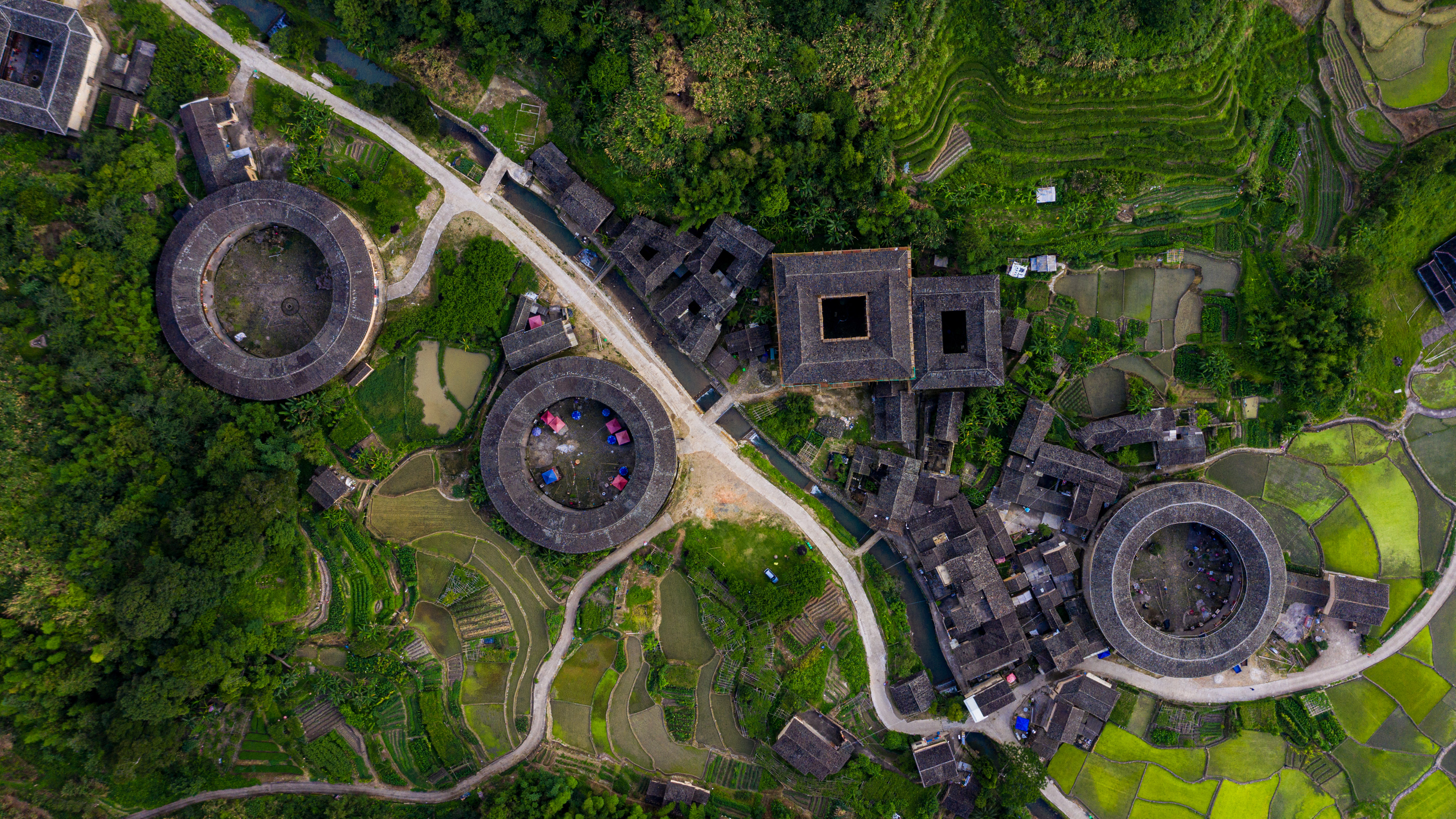 Um círculo perfeito Tulou de Fuquiém, edifícios de patrimônio histórico e cultural na província de Fuquiém, China (© Hongjie Han/Getty Images)