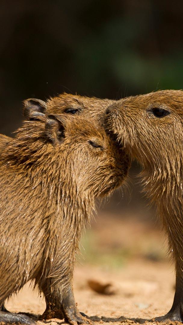 Capivaras: os Reis da Preguiça! Três capivaras juntas em um ambiente natural, Pantanal Norte, Mato Grosso, Brasil (© Joe McDonald/Getty Images)