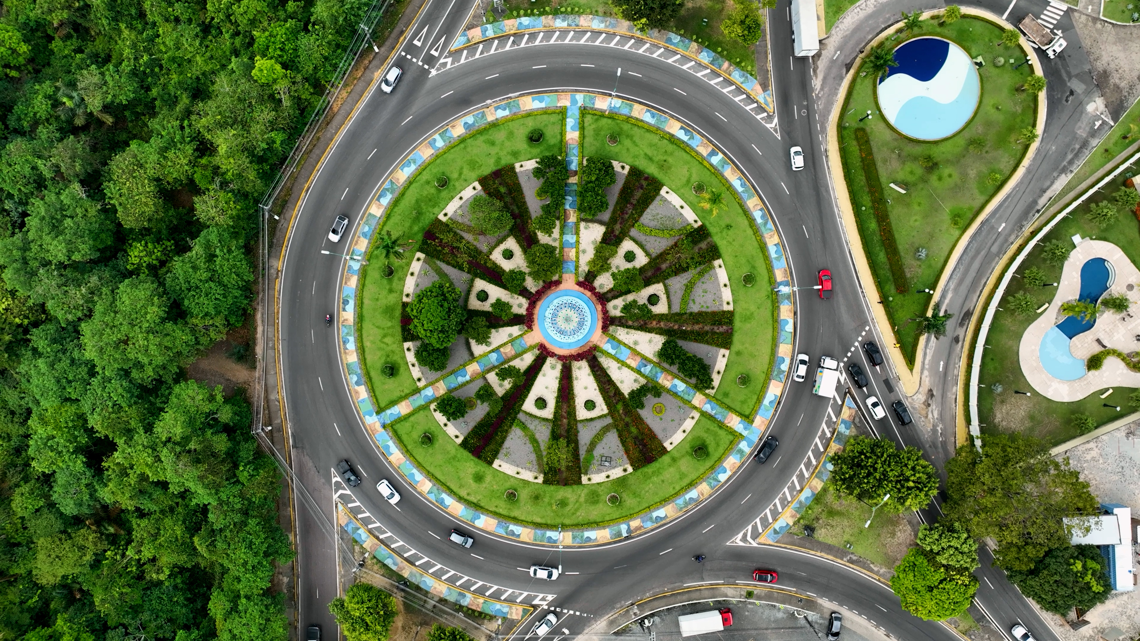 O nó das letras Vista aérea da rotatória “Bola das Letras” em Manaus, Amazonas (© Cristian Lourenço/iStock/Getty Images Plus)