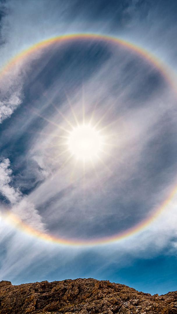 Rainbow around the sun Sun halo over Lake Antermoia in the Dolomite Mountains of Italy (© Walter Donega/Getty Images)