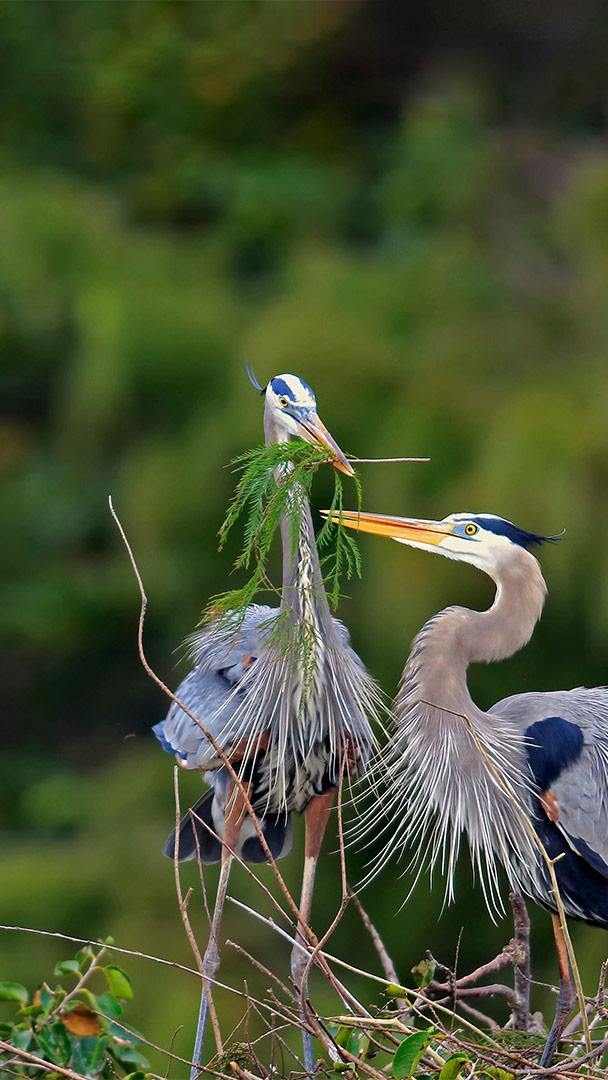 A day for giving Great blue herons building a nest in Wakodahatchee Wetlands, Delray Beach, Florida (© Imagebroker/Alamy)