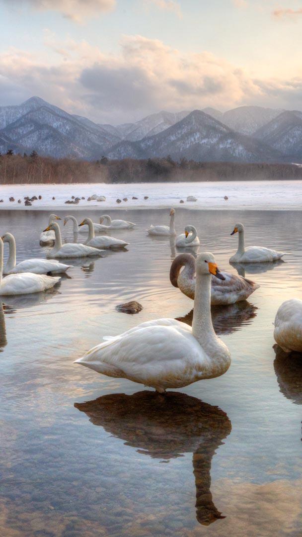 An elegant creature for a majestic setting. These all-white birds with yellow-and-black bills, gliding on the mirror of Lake Kussharo in Japan, are whooper swans—the Eurasian equivalent to the North American trumpeter swans. Named for their loud "whooping" call, these beauties, with a wingspan between 2 to 3 metres, are one of the world"s heaviest birds that are able to fly. While whooper swans are Finland"s national bird, they only spend their breeding season there. Those swans, as well as others in various northern areas, migrate to warmer, often coastal areas when cold weather sets in. All that travel doesn"t ruin their relationships—these waterfowl form strong, monogamous pairs that can last for life.