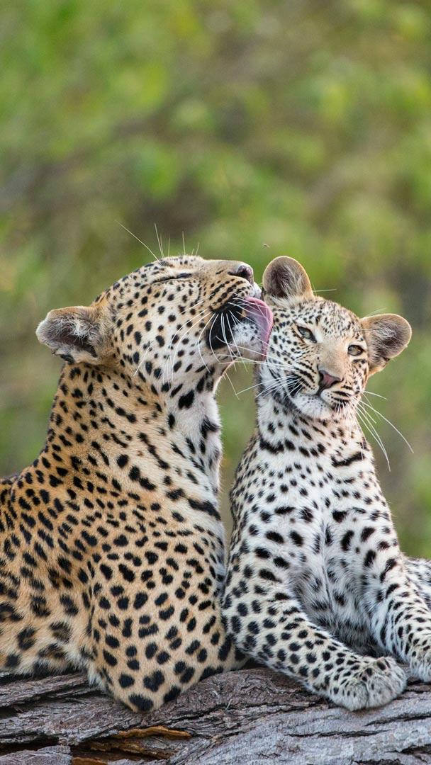 以猫科动物的方式庆祝母爱! 豹妈妈正在梳理她的幼崽,Jao保护区,博茨瓦纳 (© Suzi Eszterhas/Minden Pictures)