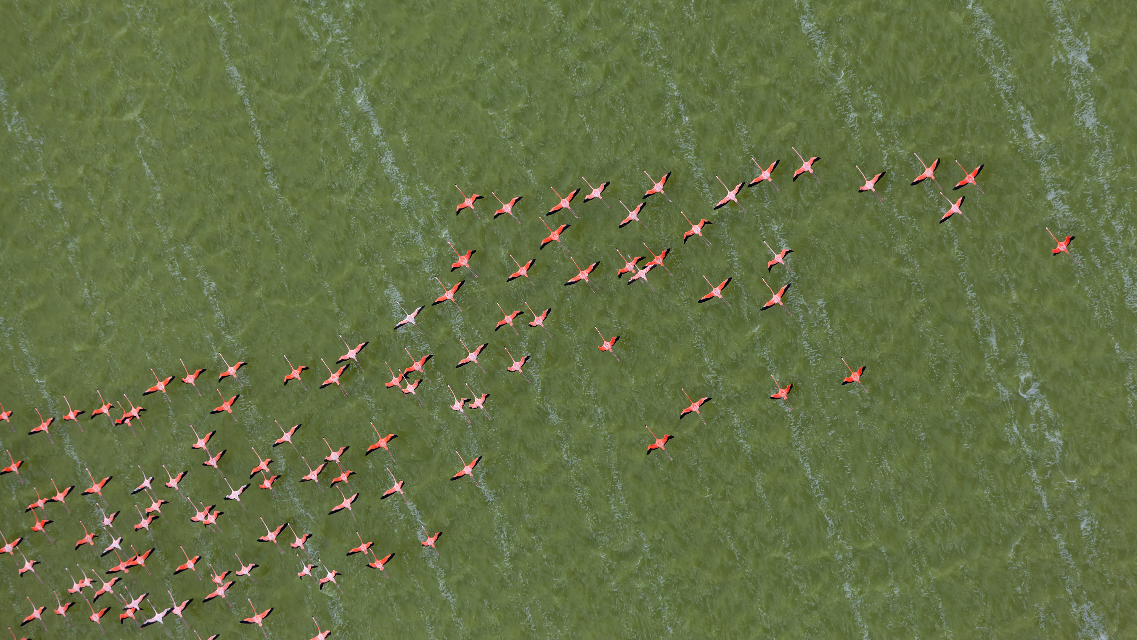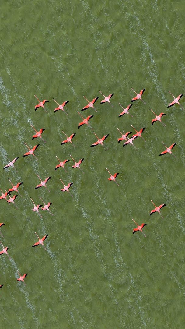Haben Sie schon einmal einen Schwarm Flamingos am Himmel gesehen? Das heutige Bild zeigt Kubaflamingos, auch Karibische Flamingos genannt, auf der Halbinsel Yucatán in Mexiko. Flamingos bilden große Gruppen, die ihnen Schutz vor Feinden bieten und dabei helfen, Nahrung effizienter zu finden. Diese Gruppen nennt man „Flamboyance“, aber auch „Stand“, „Kolonie“ oder „Herde“. Der Kubaflamingo ist die größte Flamingoart Amerikas und die einzige, die in Nordamerika heimisch ist. Diese farbenprächtigen Vögel leben in Brack- und Salzwassergebieten wie Sümpfen, Flussmündungen und Küsten. Wegen ihrer rosafarbenen Färbung werden sie oft mit Rosensichlern verwechselt, doch ihr langer Hals und ihr gebogener Schnabel machen sie unverwechselbar.