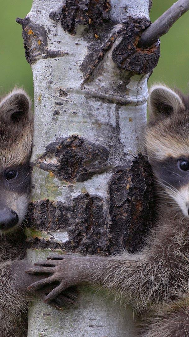 Wenn nur eine Umarmung genügt Waschbär (Procyon Lotor) zwei Babys klettern auf den Baum (© Tim Fitzharris/Minden)
