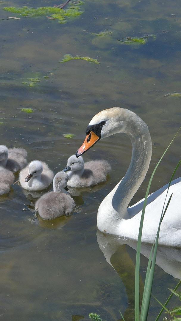 Schwimmunterricht für den Nachwuchs Schwan mit Küken, Aischgrund, Franken, Bayern (© Rüdiger Hess/geo-select FotoArt)