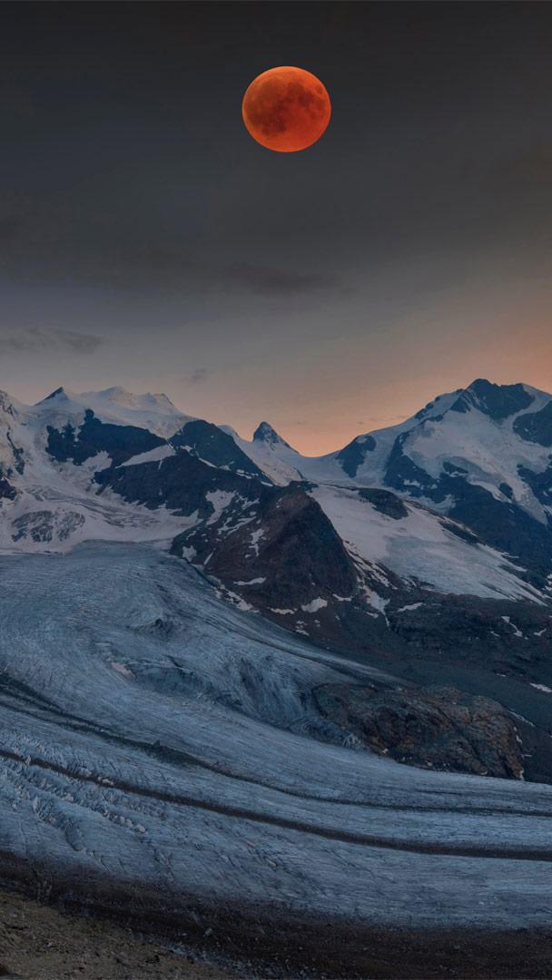 Machen Sie sich bereit für den Blutmond Panoramablick auf die Berninagruppe und den Blutmond, zentrale Ostalpen, Engadin, Schweiz (© Bernd Zoller/Shutterstock)