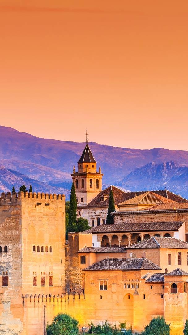 Descubre la magia de Granada en Andalucía, una ciudad repleta de historia, cultura y arte. Respira la brisa de Sierra Nevada y, al caer la noche, contempla el reflejo de las estrellas en los palacios de la Alhambra (fortaleza roja en árabe). Estos palacios de antiguos emires y monarcas, cuya belleza y complejidad arquitectónica seduce a viajeros con sus vibrantes azulejos y jardines parecen sacados de cuentos de hadas. Entre jardines del Generalife y las íntimas callejuelas del Albaicín, el pasado cobra vida ante los ojos del turista.