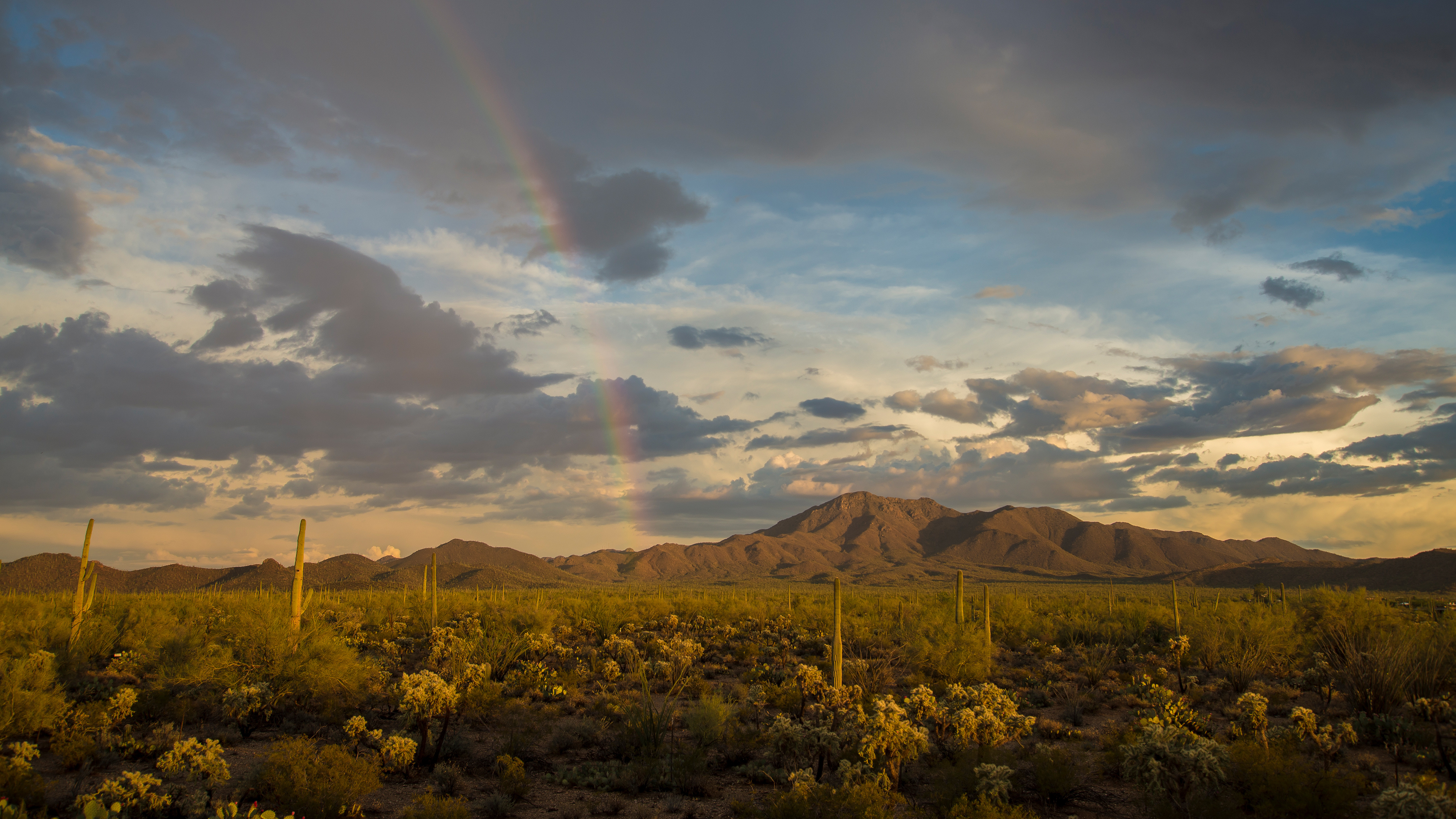 Arco iris sobre el Pico Wasson, Parque Nacional Saguaro, Arizona, EE. UU. © Frank Staub/Getty Images