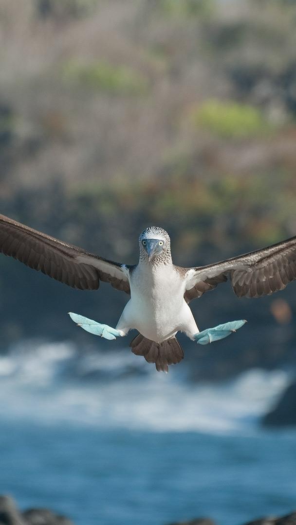 Prêt pour l’atterrissage ! Fou à pieds bleus, îles Galapagos, Équateur (© Tui De Roy/Minden Pictures)