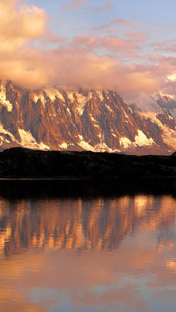 Là où l’air est le plus pur Massif du Mont Blanc au coucher du soleil se reflétant sur l’un des lacs de Chéserys, Chamonix, France (© Stefan Huwiler/imageBROKER/Alamy)