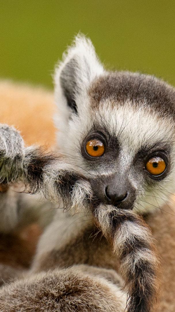 It looks like this small creature is playing a game, right? But when a baby ring-tailed lemur wraps its tail around or gives it a tug, it"s actually working on crucial skills. The infants spend their early weeks hanging tight to their mom, first clinging to her belly and later to her back. As they grow, they separate from their mom and tail-chasing becomes part of how they learn balance, coordination and group play. These primates use their long tails for communication as well. Raised like flags during group movement, the tails help them stick together in open terrain. Loud, rhythmic calls, scent markings and "stink fights" between males add to the social drama. Ring-tailed lemurs are found only in southern and southwestern Madagascar, where they live in dry forests, spiny thickets and rocky outcrops.