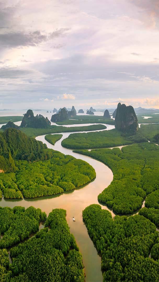 Benvenuto ai Tropici, dove terra e mare si fondono Foresta di mangrovie nella baia di Phang Nga, Mare delle Andamane, Thailandia (© Ratnakorn Piyasirisorost/Getty Images)