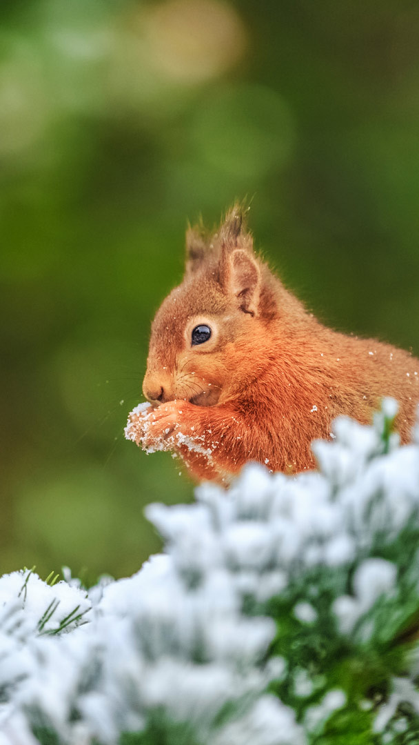 雪の積もった松の枝にとまるキタリス