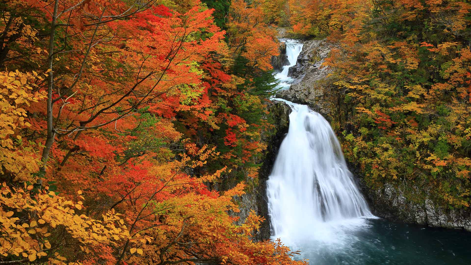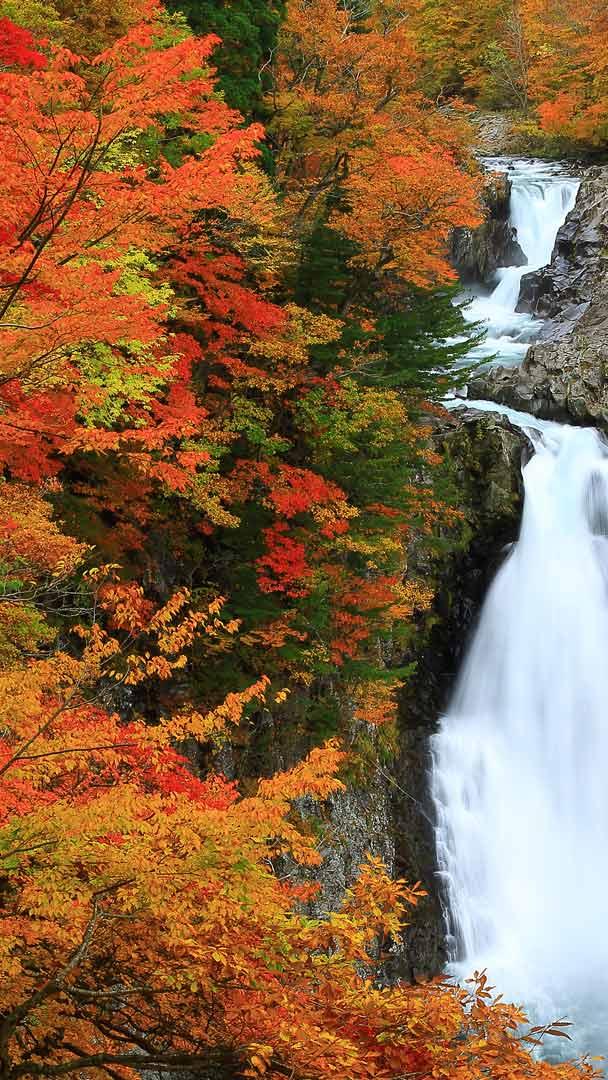 今日 10 月 23 日は二十四節気の「霜降」。朝晩の冷え込みが一層厳しくなり、地面や草木に霜が降りる時期です。木々の紅葉が進み、秋田県由利本荘市の「法体の滝」を取り囲む木々も、鮮やかな赤や黄色に染まり、滝の白い水しぶきとコントラストを描きます…