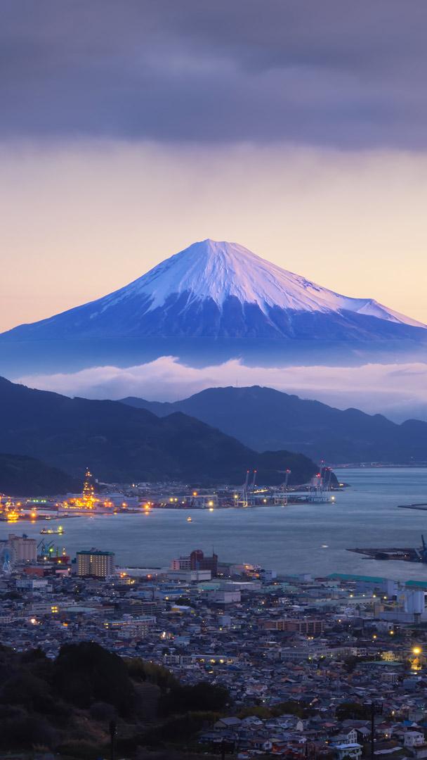今日 2 月 23 日は天皇誕生日であり、「富士山 (223) 」の語呂合わせで、静岡県と山梨県が制定した「富士山の日」でもあります。この日を祝して、静岡県の景勝地、日本平から望む富士山と清水港の夕景をお届けします。清水港は、長崎港と神戸港と並び「日本三大美港」に数えられており、クルーズ客船の寄港も多く、近年は貿易港としてだけではなく、観光港としても整備されています。