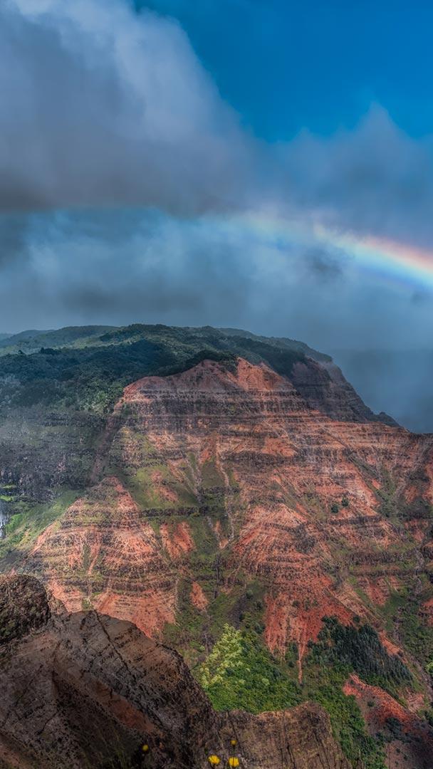 ワイメア渓谷とワイポオ滝にかかる虹 カウアイ島, 米国 ハワイ州 (© Beverley Van Praagh/Getty Images)
