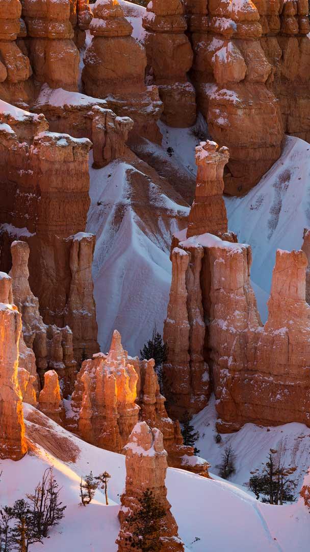 ここは米国ユタ州にあるブライスキャニオン国立公園。侵食でできた色鮮やかな岩の尖塔であるフードゥーが無数に並び、巨大な自然の円形劇場を創り出しています。日の出や日の入り時には、太陽の光を反射してさらに美しい輝きを放ちます…