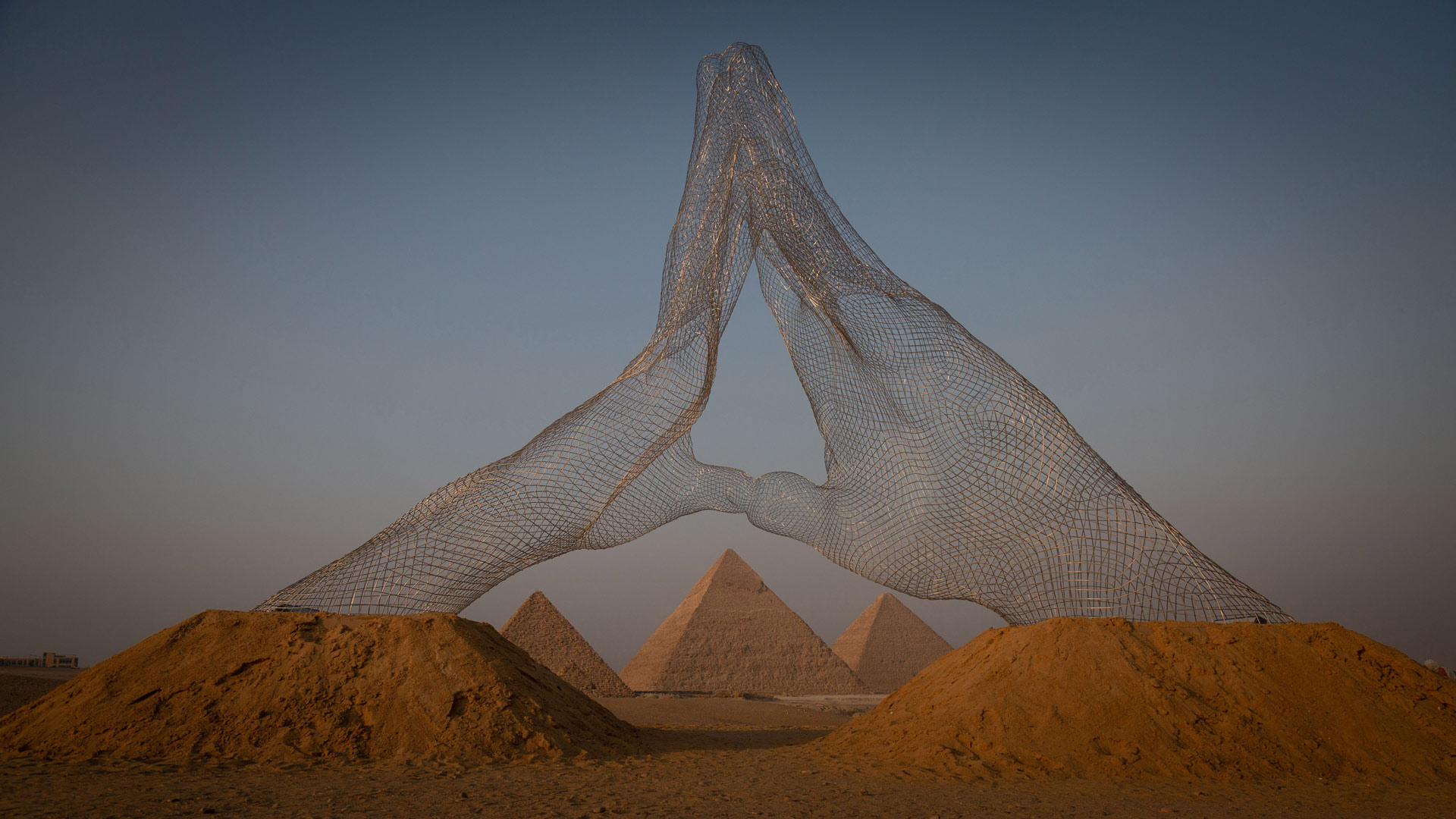 When art imitates life Together by Lorenzo Quinn, Great Pyramids of Giza, Cairo, Egypt (© Sima Diab/Getty Images)