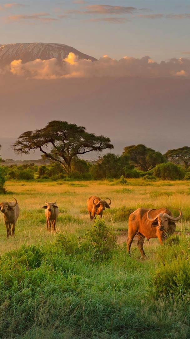 Living in harmony Mount Kilimanjaro with Cape buffalo in foreground, Amboseli Biosphere Reserve, Kenya (© RealityImages/Shutterstock)