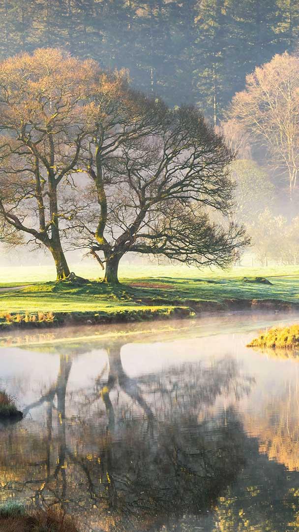 Reflecting the beauty of the Lakes Misty sunrise on the River Brathay in the Lake District, Cumbria (© fstopphotography/Getty Images)