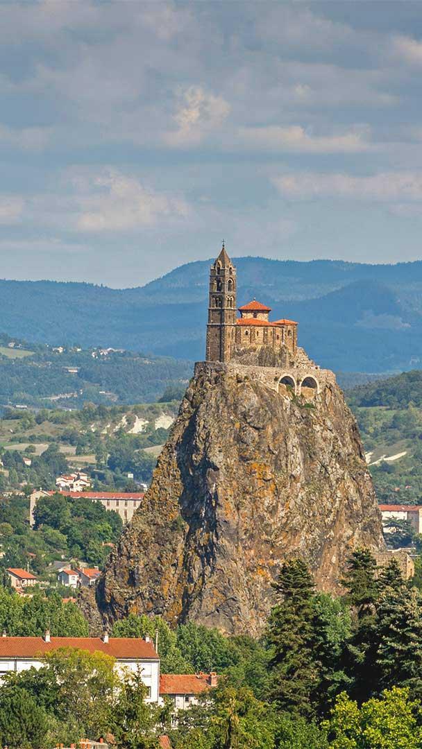 Pace yourself—you"ll need to climb 268 stone steps to reach the entrance of Chapel St-Michel d"Aiguilhe (Chapel of St. Michael of the Needle). This historic church near Le Puy-en-Velay, France, is a UNESCO World Heritage Site that attracts visitors from around the world. It was constructed in 969 by a local bishop and dedicated to the Archangel Michael, the patron saint of mountaintops. Even before the chapel was built, the site had spiritual significance, as it was home to prehistoric dolmens (stone tombs) built by the Romans to honor their god Mercury.