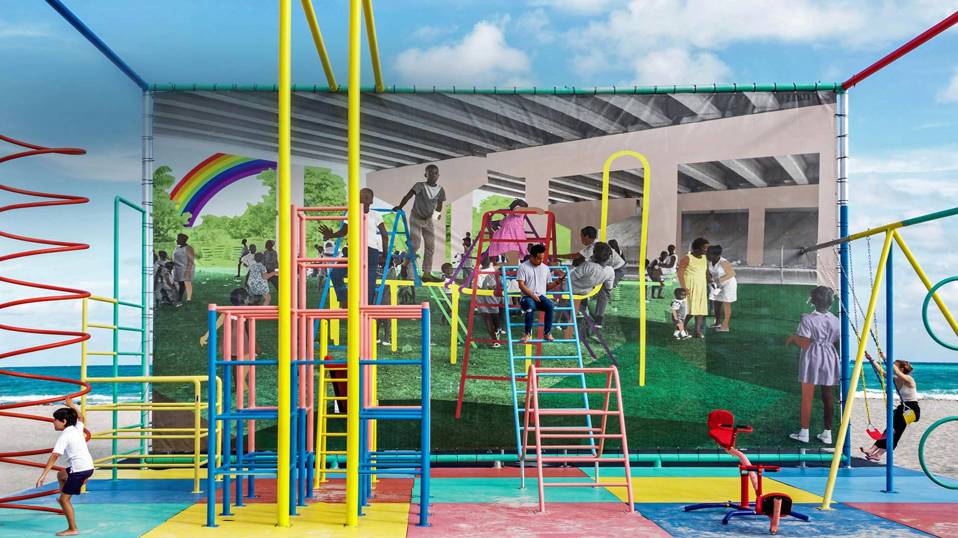 In honor of Miami Art Week, which is underway right now in Miami, we"re looking at a work called "America"s Playground" by New York-based artist Derrick Adams. The installation was featured during 2018"s Art Week and was inspired by a 1969 photo Adams found in the Black Archives at the Historic Lyric Theater in Miami. The photo shows African American children at a playground beneath a freeway in Miami’s Overtown neighborhood, a historically African American neighborhood which was nearly destroyed by highway construction in the 1960s. The construction displaced thousands of black residents from their homes, threatening the livelihood of the community. In the late 1960s, city officials and private donors pieced together funding to install a playground under the new overpass. The park was well used for a time, but due to lack of lighting and maintenance, it eventually fell into disuse.