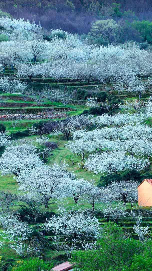 As winter turns to spring in the Jerte Valley, all eyes are on the cherry blossoms. This tiny region in the province of Cáceres, Spain, has the perfect microclimate for cherry trees, and there are more than 1.5 million of them here in 23 square miles. The cherry blossoms last just two weeks before the petals rain down, covering the entire valley. About 40 days later, the first cherries are ready to be picked. Locals make wine, beer, and various foods with them. Cherries are also used for spa and beauty treatments, since they have antioxidants and anti-inflammatory properties, in addition to vitamins and ellagic acid.