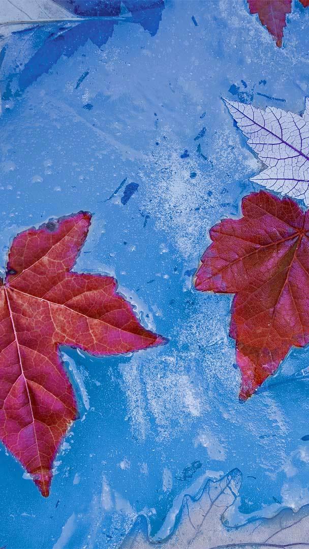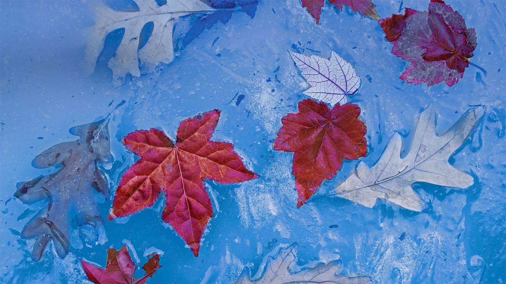 Sometimes the transition from fall to winter is an abrupt one—as demonstrated by these pristine, colorful leaves seemingly frozen in time. The cold might convince you we"re enjoying a customary leaf-peeping tour of frigid New England—but we"re hundreds of miles farther south.