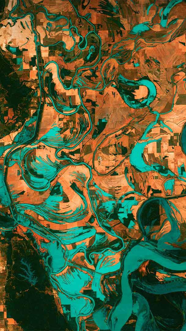 It"s Earth Day today and we are high above the blue marble looking down on the border between Arkansas and Mississippi. Those small, blocky shapes are towns, fields, and pastures, and the teal green is the mighty Mississippi River. Anyone who has flown in the window seat of an airplane and gazed down at Earth below might wonder why the colors in this image look so unreal. That"s because they are. This image was taken in 2013 by Landsat 7, a NASA satellite that uses thermal infrared sensors to help scientists better distinguish flora, fauna, water, and manmade objects. For almost 50 years, NASA has been using satellite imagery to understand how climate change and population growth are affecting our fragile planet. These satellites help NASA see where deforestation and wildfires are happening, where glaciers are melting, and how rising waters are encroaching on cities.