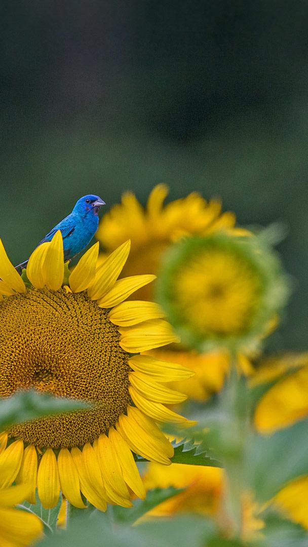 This time of year, from late spring to summer, male adult indigo buntings take it up a notch and turn a brilliant deep blue. They fly to a high perch—like our cheerful fellow atop a sunflower—and sing from morning to night to try to catch the attention of females. Indigo buntings are members of the "blue" clade (subgroup) of the cardinal family. During breeding season, you"ll find the small, seed-loving songbirds in brushy habitats in pastures, along roadways, and at the edges of forests throughout eastern and central North America, from southern Canada down to Florida. But you"ll have to keep a sharp eye out for the plain brown females, who are usually tending to their young deep in the thicket.
