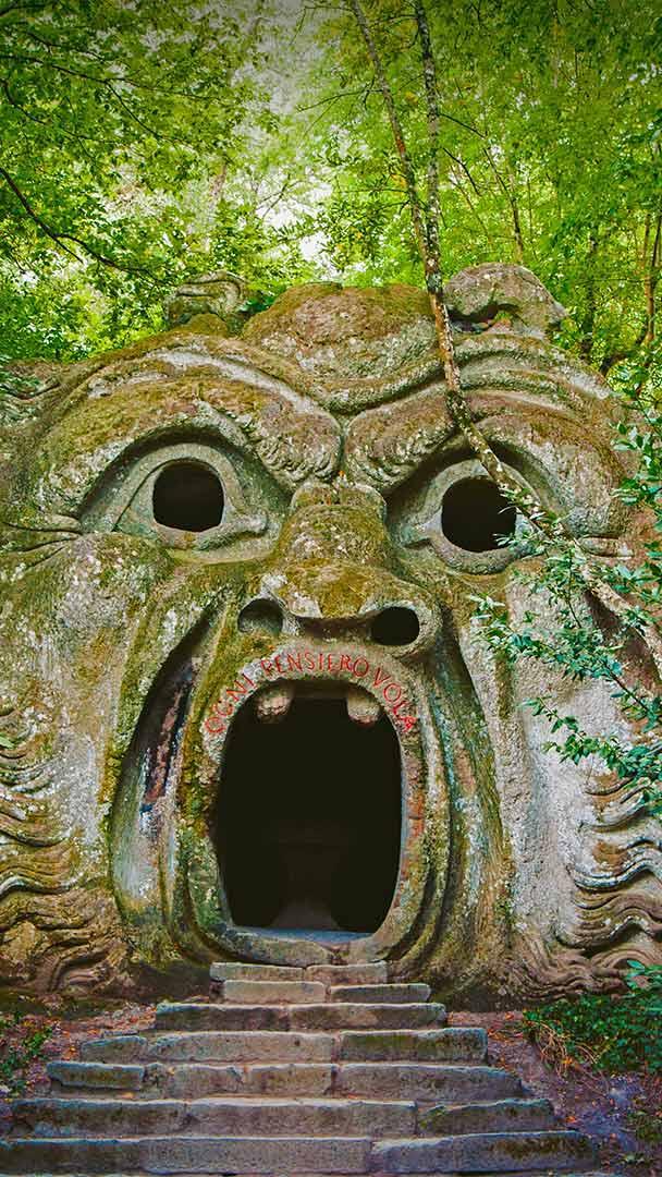 Join us for a pre-Halloween trip to a small Italian town about 60 miles northwest of Rome. We"re taking you to Bomarzo, where a once-forgotten 16th-century garden holds monstrous sculptures that are meant to evoke anything but pleasure. In our photo, "The Mouth of Orcus," a Roman god of the underworld and punisher of broken oaths, gives visitors the feeling of being swallowed into the abyss. During a visit to the Parco dei Mostri (Park of the Monsters), as it"s known, you"ll come across other grotesque sights such as a dragon being attacked by lions, a giant shredding a man, and Hannibal"s elephant snatching a Roman soldier.