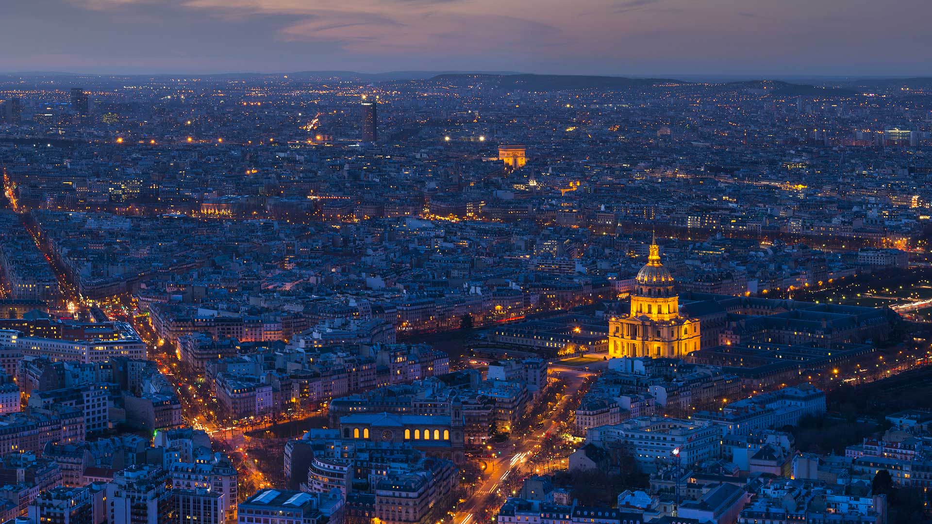 As twilight turns to night, the city of Paris lights up. Streets and buildings are bathed in light, alongside grand monuments such as the Hôtel National des Invalides, whose famous dome shines out in our homepage image. It was built during the 17th century under Louis XIV, as a hospital and home for army veterans. It was also Louis XIV, known as the Sun King, who ordered streetlights to be erected throughout the city to light up dark alleys where lawbreakers might lurk. Parisians were also asked to put up lanterns and oil lamps, and place lit candles in their windows.
