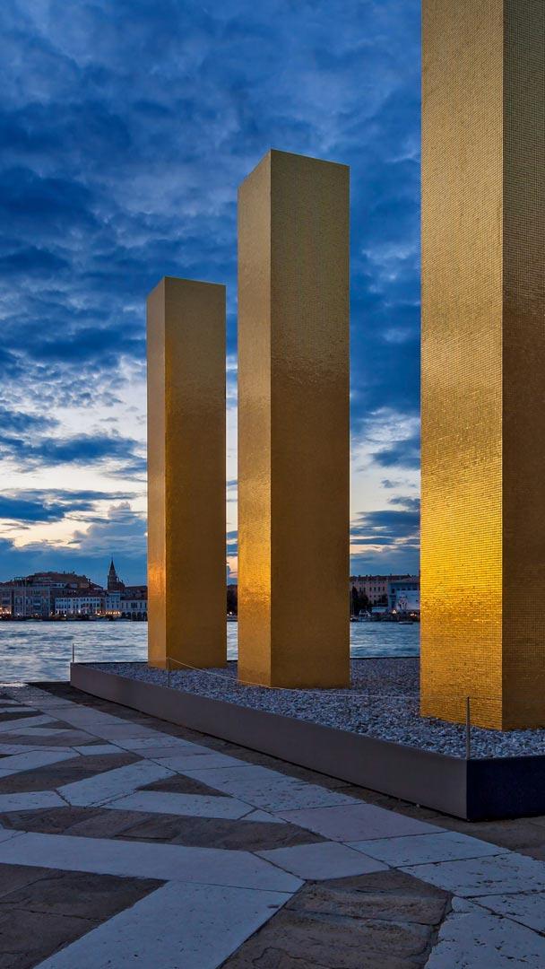 Here in the canal city of Venice, sun and water reflect off artist Heinz Mack’s sculpture called The Sky Over Nine Columns. The piece was on display here in on the island of San Giorgio Magiorre in 2014, during the Venice Architecture Biennale, and later traveled to Istanbul and Valencia. Visitors are encouraged to wander through the pillars as if wandering through a temple connecting the Earth to the sky. A closer look reveals the massive pillars are covered in 850,000 mosaic tiles coated in 24-carat gold leaf.